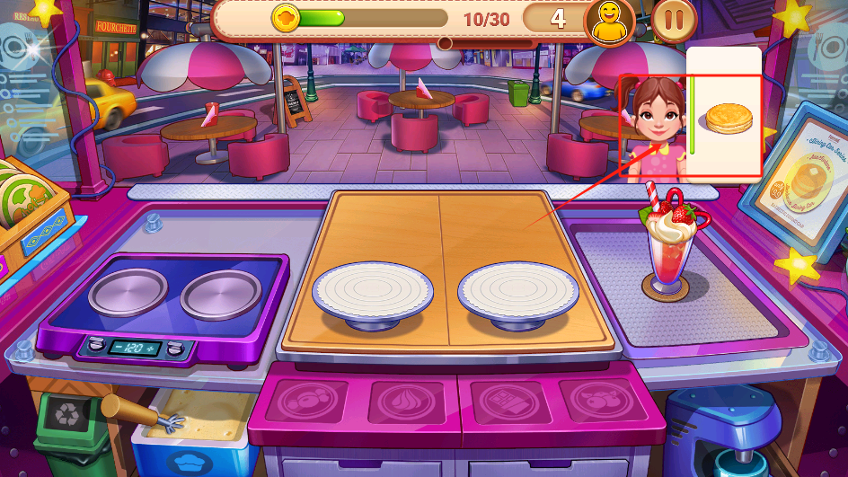 3、同时做4个煎饼,看进度13/30,煎好装盘送给四个顾客。