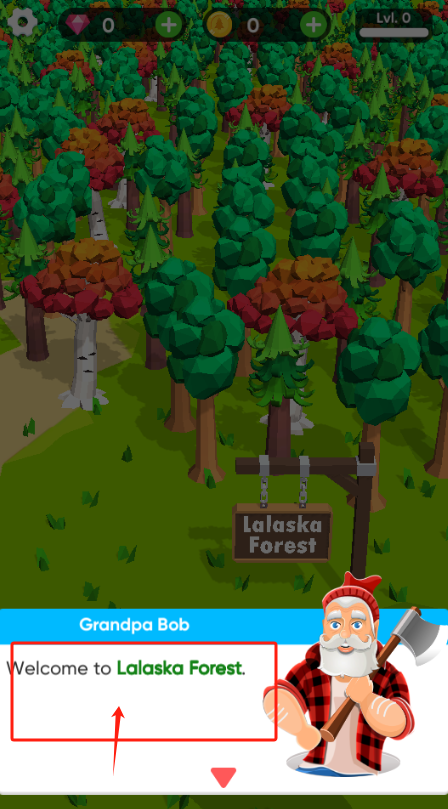 1、点老爷爷开始游戏,看森林场景,上方显示等级和欢迎语。