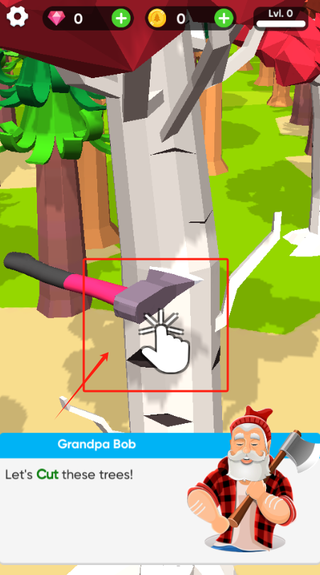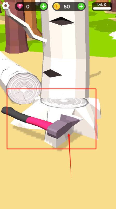 3、捡起粉色斧头换装备,砍倒的木头自动变成金币和经验。