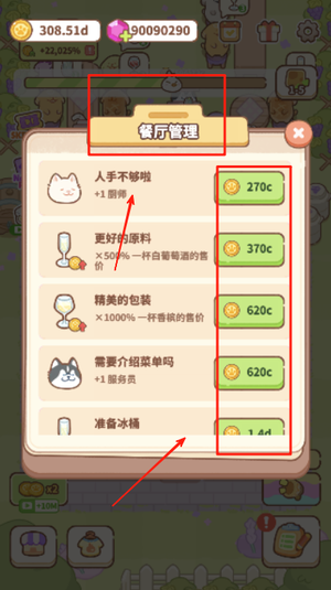 2、通过金币奖励升级厨房设备与菜单选项,长按装饰品可拖动摆放调整餐厅布局形成全新主题风格带来额外收益。