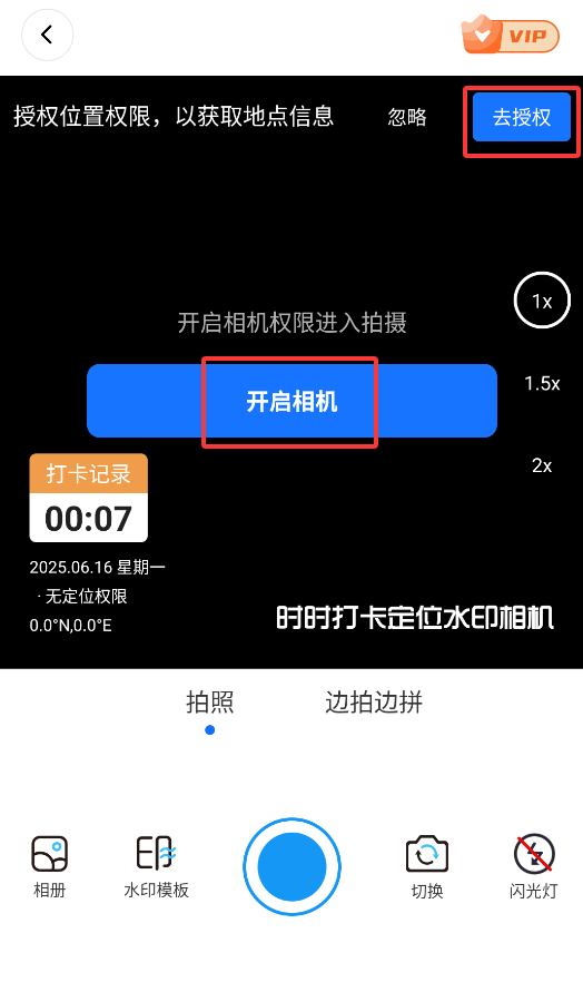 2、根据指引依次允许相机访问和位置权限,确保水印信息能够正常显示。