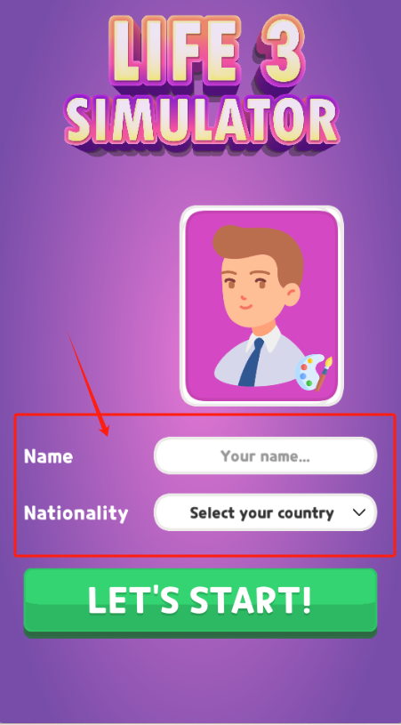 1、在紫色界面输入名字和国籍,点绿色LETS START按钮开始游戏。