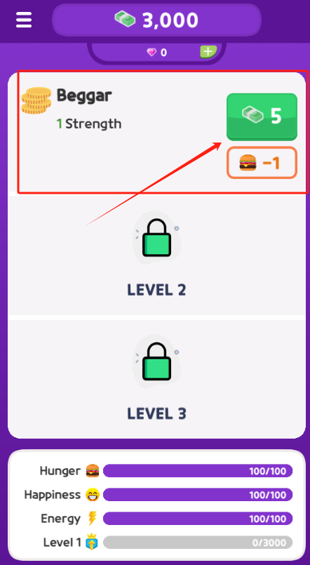 2、乞丐角色有3000金币,点绿色+5图标赚钱,橙色-1汉堡图标买食物。