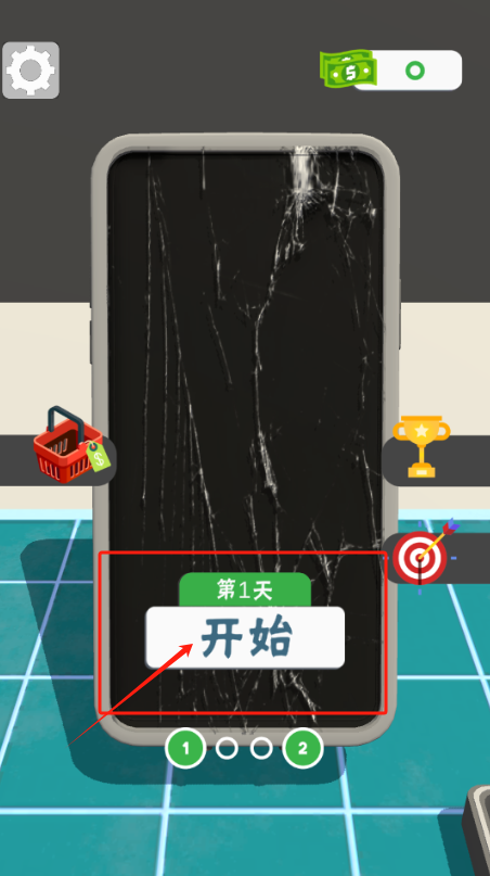 1、点屏幕中间的开始按钮进入第一关,左上齿轮是设置,右上5美元是奖励。