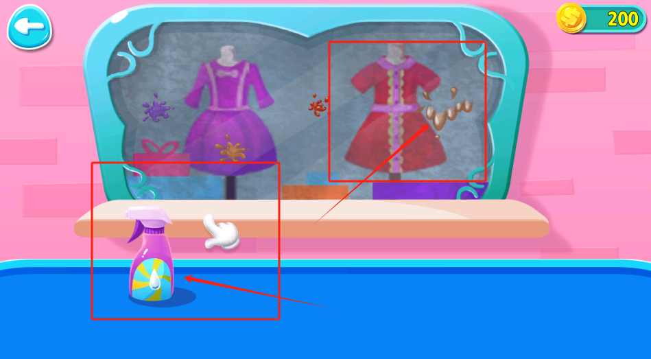 3、选紫色喷雾瓶清洗镜子里的脏裙子,让衣服恢复干净。