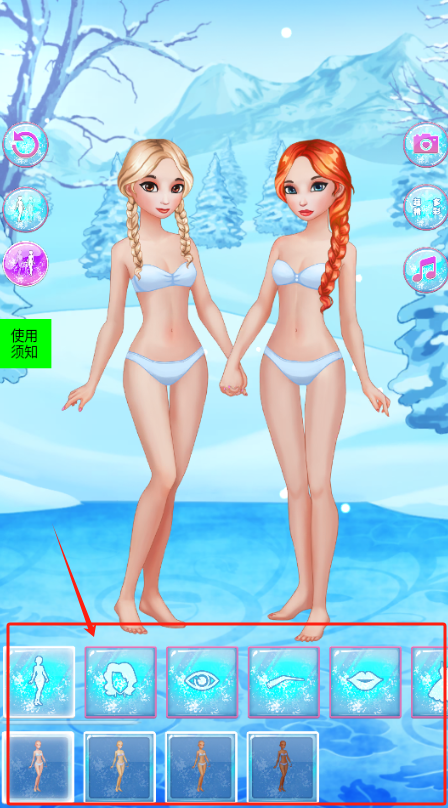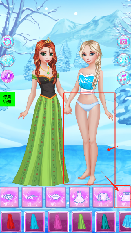 2、选择红框框住的安娜或爱莎,点下方衣服图标给她们换新裙子。