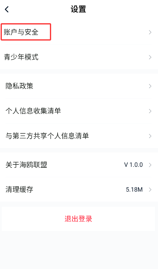 2、选择账户与安全选项,滑动至页面底部找到账户管理功能区。