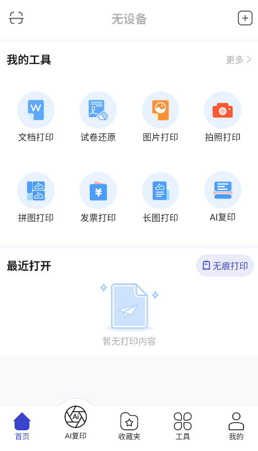 1、启动APP后,在“智能工具”专区可选择文档打印、试卷去笔迹还原等实用功能,支持PDF/图片多种格式。
