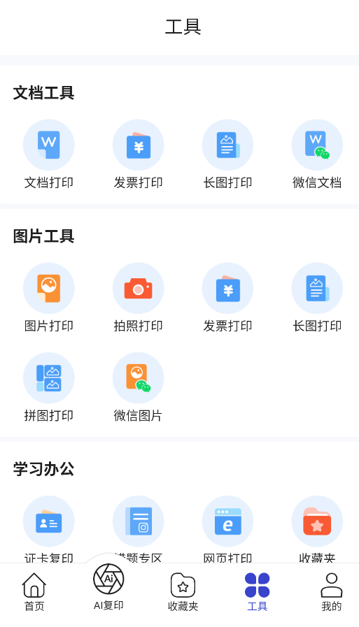 2、主界面分类清晰明确直观,根据打印内容类型选择文档、照片或发票等对应功能模块进行操作。