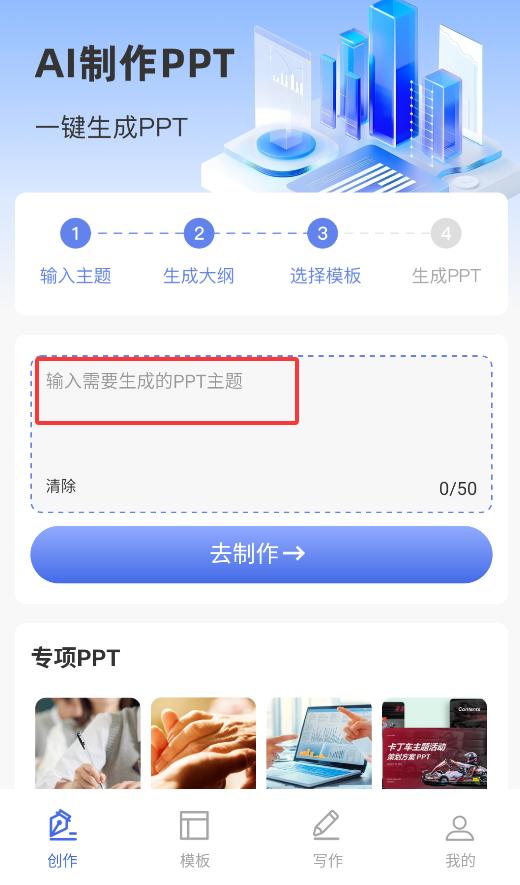 1、启动APP后,在首页输入主题(如“2024新能源汽车市场分析”),点击“智能生成”,AI会自动创建包含图表/排版的完整PPT。