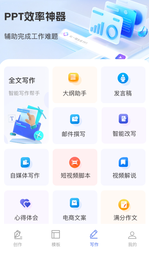 3、使用“AI写作”功能快速生成大纲、演讲稿或自媒体脚本,支持对现有内容智能润色优化。