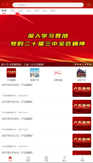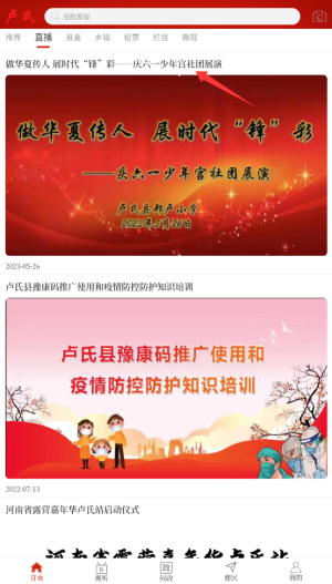 1、进入云上卢氏APP后,在首页导航栏选择"直播"栏目,这里展示各类本地实时直播内容。