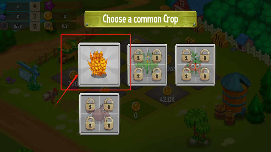 2、选火焰图标作物种植,要花20金币,其他灰色的是锁着的。