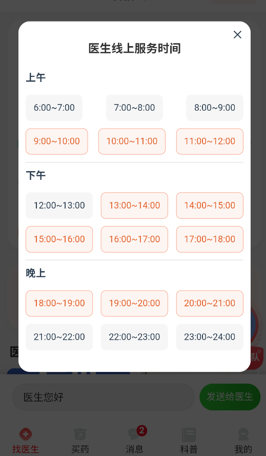 2、医生主页清晰标注可预约时段(绿色为可约),选择合适时间后,需填写基本症状描述完成挂号。