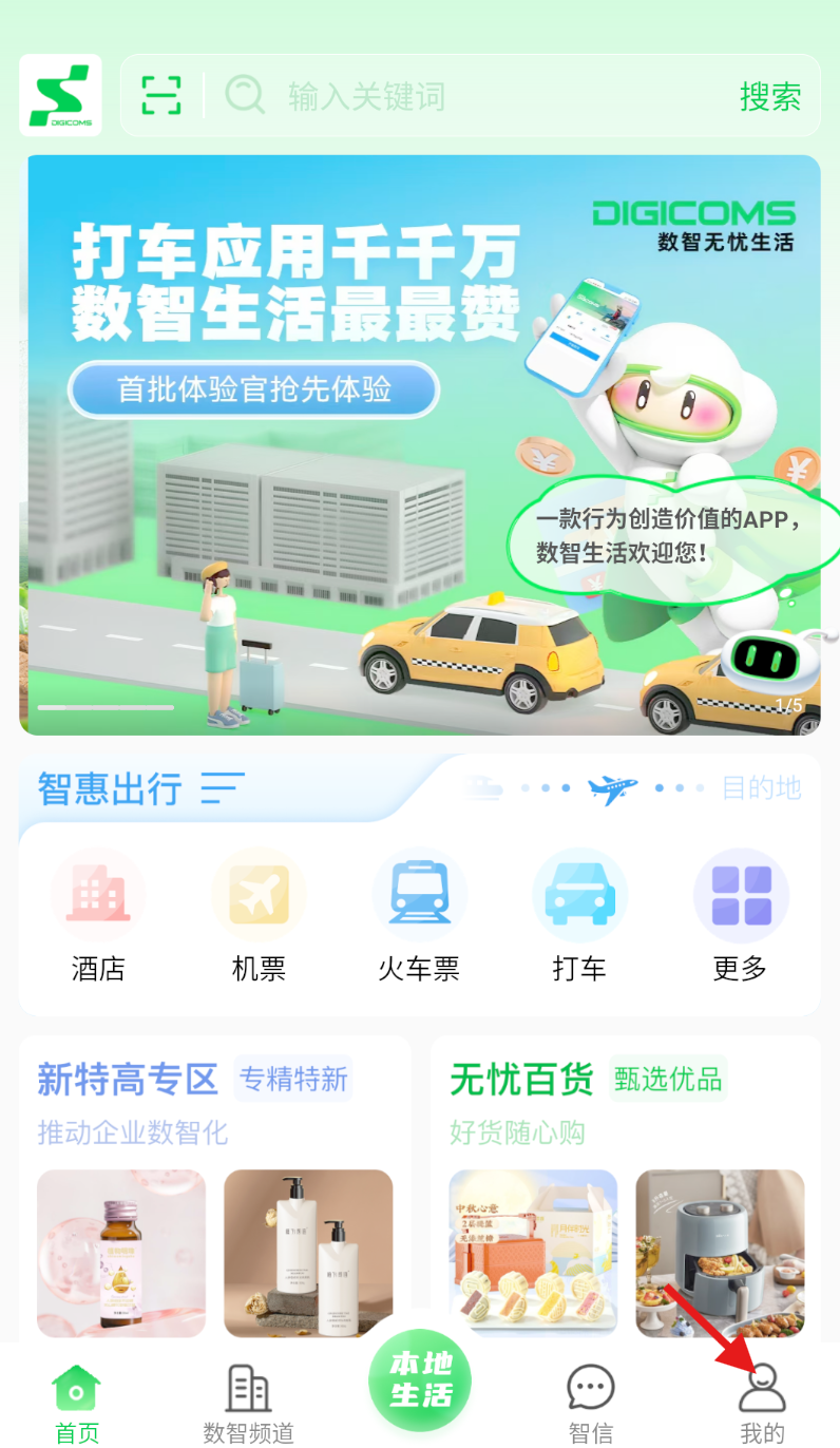 1、打开数智无忧生活软件,在界面底部导航栏内,找到并点击 “我的” 标识。