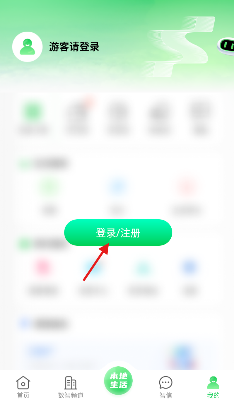 2、进入 “我的” 页面后,在相关功能区域中,点击 “登录 / 注册” 选项按钮。