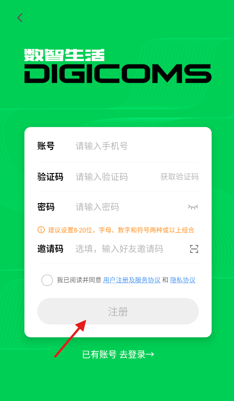4、在注册页面依次填入手机号,获取并输入验证码,设置登录密码,确认后点击注册完成账号创建。