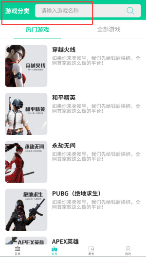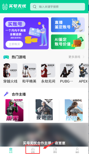 1、启动买号无忧APP后,在首页点击"买号"功能入口,进入游戏账号交易专区。