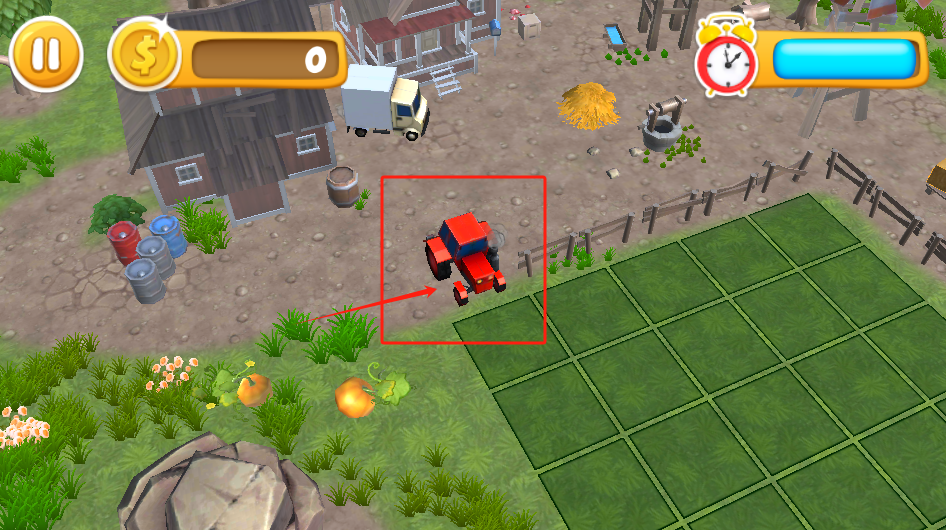 3、开红框里的拖拉机干活,右上角看时间和金币数量。