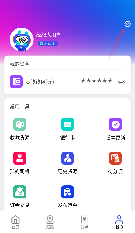 1、登录APP后进入"我的"页面,点击右上角齿轮图标进入设置中心。
