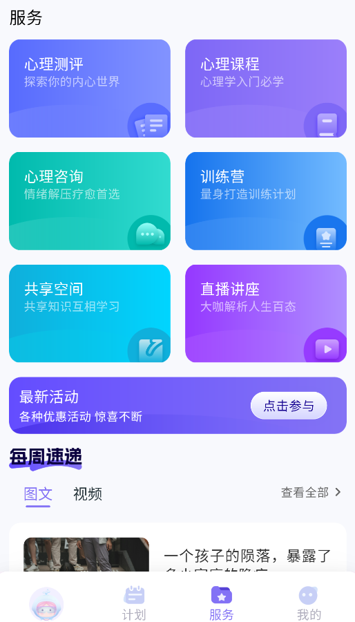 3、服务专区提供专业心理测评工具、精选心理课程、最新心理资讯以及互动式训练营等全方位心理健康服务。