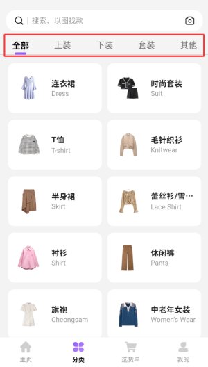 1、进入衣衫汇女装货源APP后,在首页选择需要的服装分类,如上衣、裙子等。