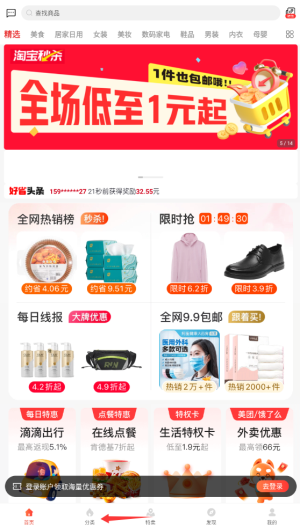 1、启动优百惠APP后,在首页点击"分类"选项,浏览各类商品品类。