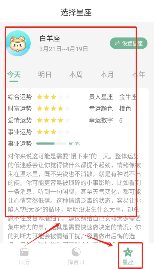 3、在星座运势板块,能查看各星座当天的运势情况和相关解析。