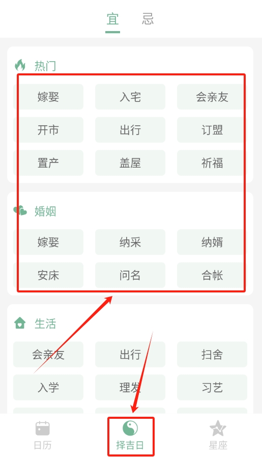 2、进入择吉日页面,可根据需求挑选适合办事的黄道吉日。