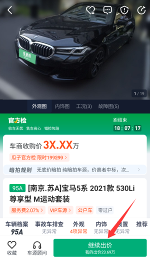 3、确认车辆信息后,点击右下角"继续开价"按钮即可参与竞拍流程。