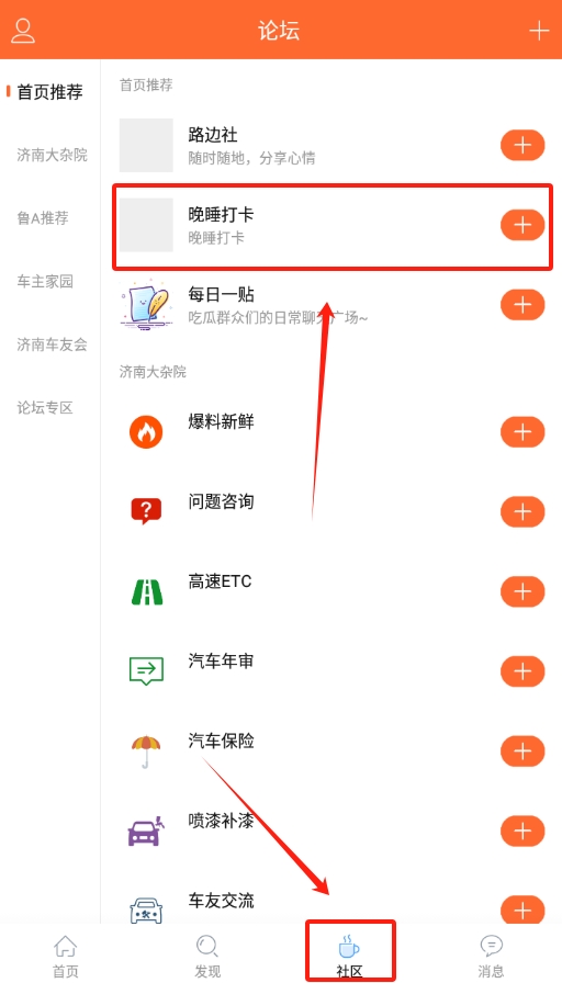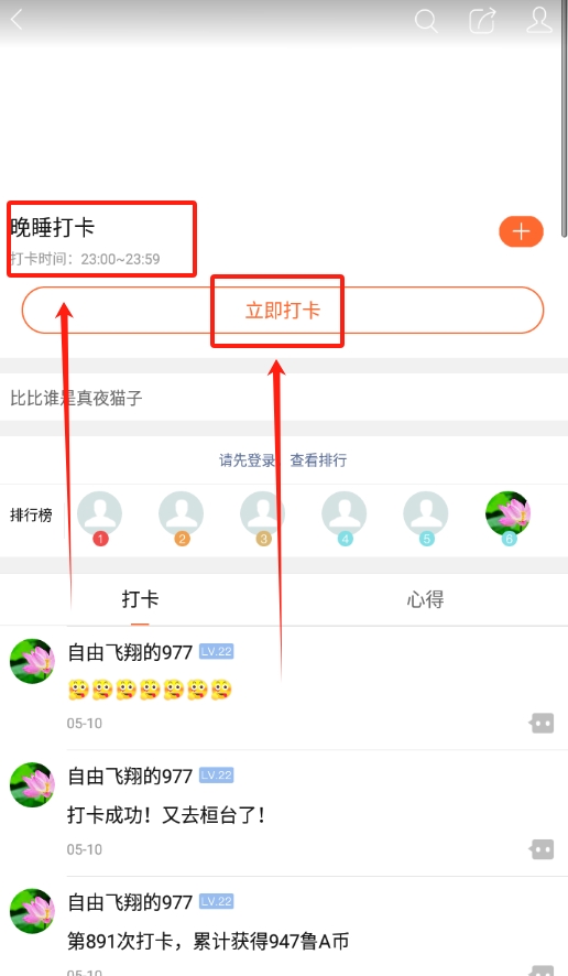 2、登录成功后,进入社区页面,在页面里找到晚睡打卡的入口,点击进入打卡板块。