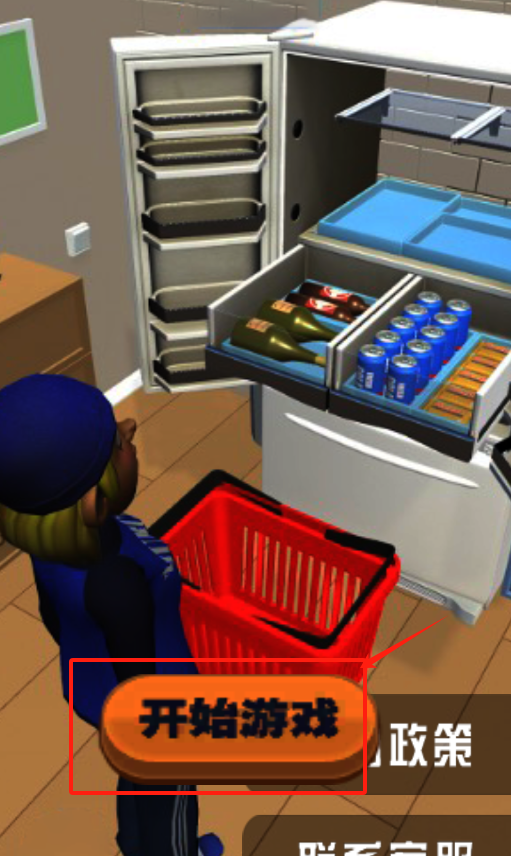 1、看到戴蓝帽子的人站着看冰箱,点下面橙色开始游戏按钮,就能进入超市采购闯关游戏啦。