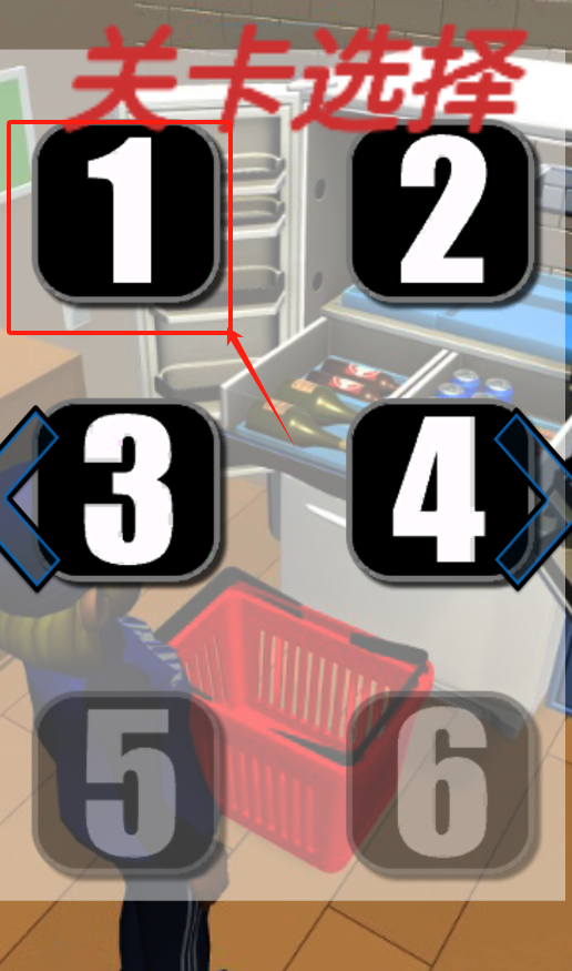 2、看到六个黑色方块标着关卡数字,点红框圈住的数字1,就能开始第一关的冰箱大采购挑战哟。