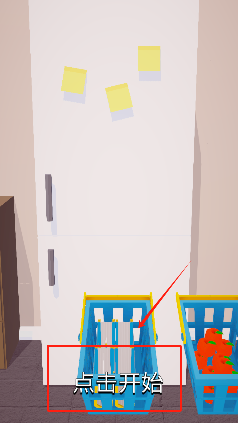 3、看到冰箱前有两个蓝色篮子,点下面红框里的点击开始字样,马上开启紧张刺激的购物计时赛呀。