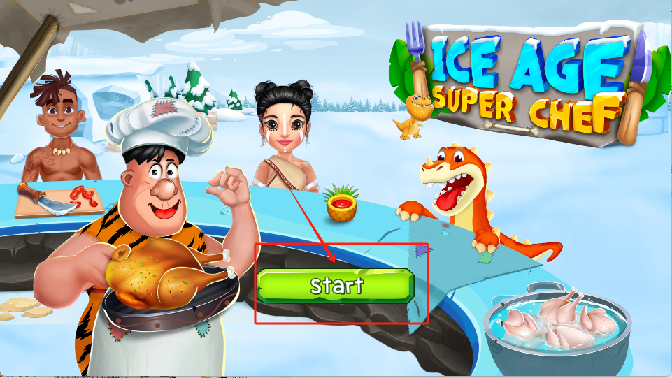 2、戳绿色Start方框按钮开始游戏,背景冰雪世界里有恐龙和原始人。