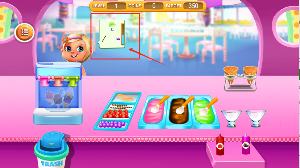 3、点击红色框选区域查看任务要求,用冰淇淋机制作甜筒达到目标金币数。
