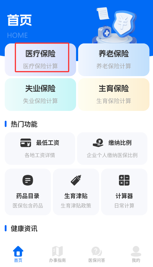 1、打开APP后,首页提供五险一金计算器,可选择医疗、养老等不同险种进行专项测算。