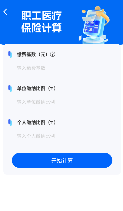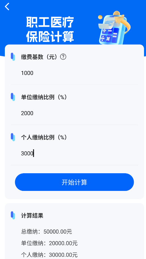 2、以医保计算为例,输入当地缴费基数,填写单位与个人缴纳比例后点击计算按钮。
