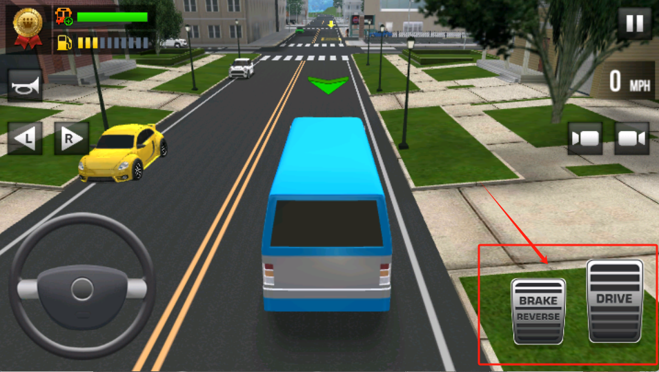 3、通过屏幕下方虚拟方向盘和踏板控制蓝色大巴车行驶方向与速度。