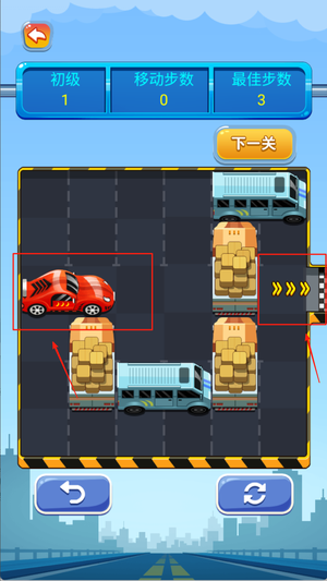 1、玩家需要根据当前停车场布局,判断哪些车辆可以移动,并找出合理的挪车顺序为红车让路。