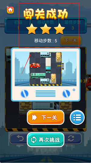 3、步数评价系统激励玩家不断优化挪车路线,尽量用最少步骤完成目标,提高成就感和挑战欲望。