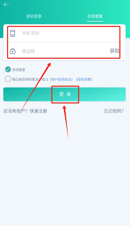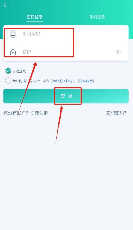 1、打开龙江电力缴费,点击登录按钮,在登录页面输入自己的手机号和设置的密码,填写完成后点击确认就能登录进去。