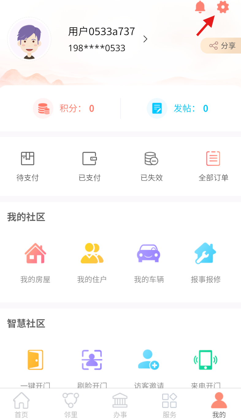 4、“我的” 板块服务:涵盖房屋、住户等线上管理服务,配备一键开门等智慧功能,保障生活便利与安全。