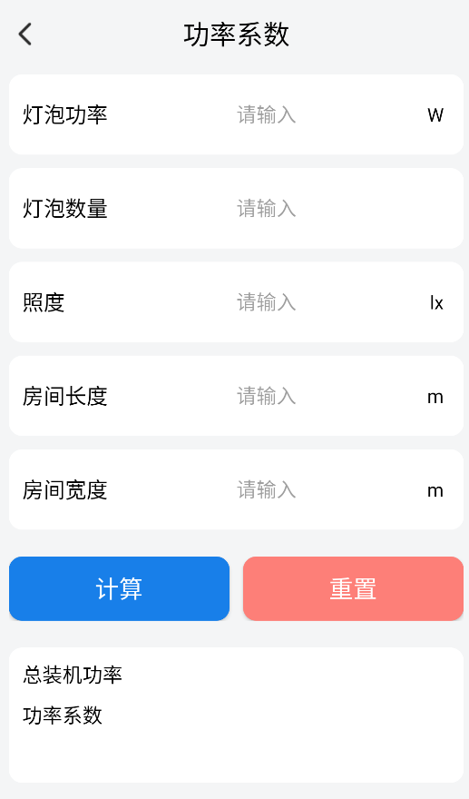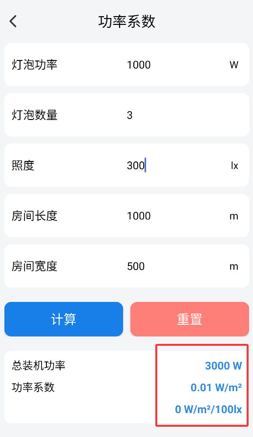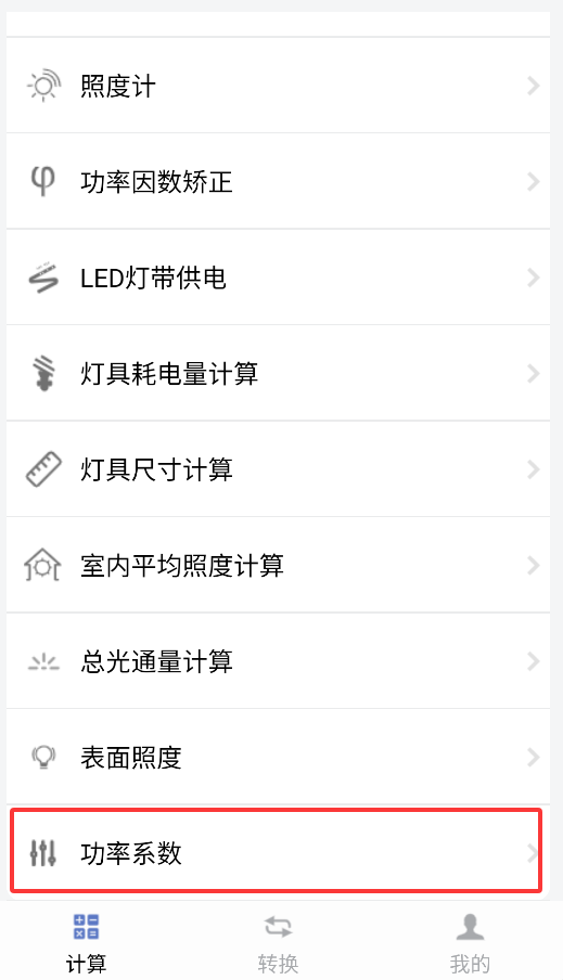 1、启动应用后,在首页选择"照明功率计算"功能进入专业计算界面。