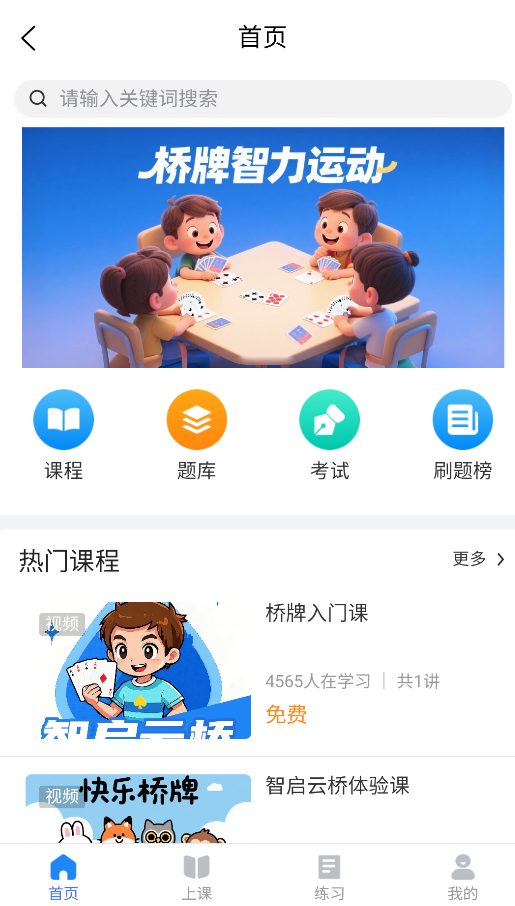 1、打开应用后,在首页可浏览各类桥牌教学课程、专业题库及学员考试排名榜单。