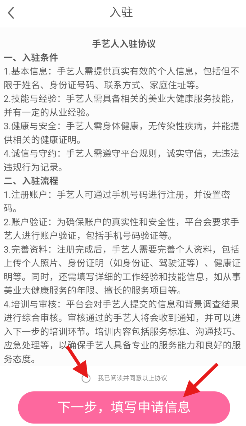 3、阅读手艺人入驻协议内容,确认无误后勾选同意选项,接着点击 “下一步” 进入申请信息填写页面。