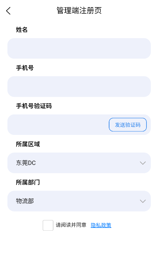4、管理人员注册时需补充所属机构信息,并通过短信验证码完成身份核验步骤。