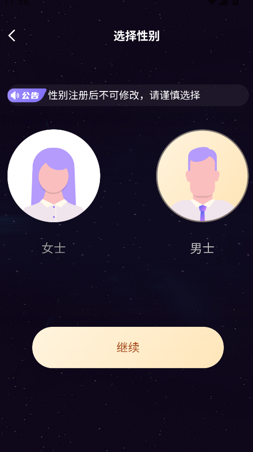 2、首次注册需选择性别(男/女),该信息一经确认将无法修改,请谨慎选择。