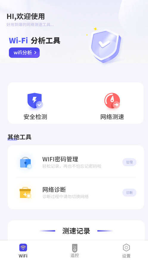 1、启动应用后,主界面提供网络测速、设备安全检测等核心功能入口,方便快速使用。