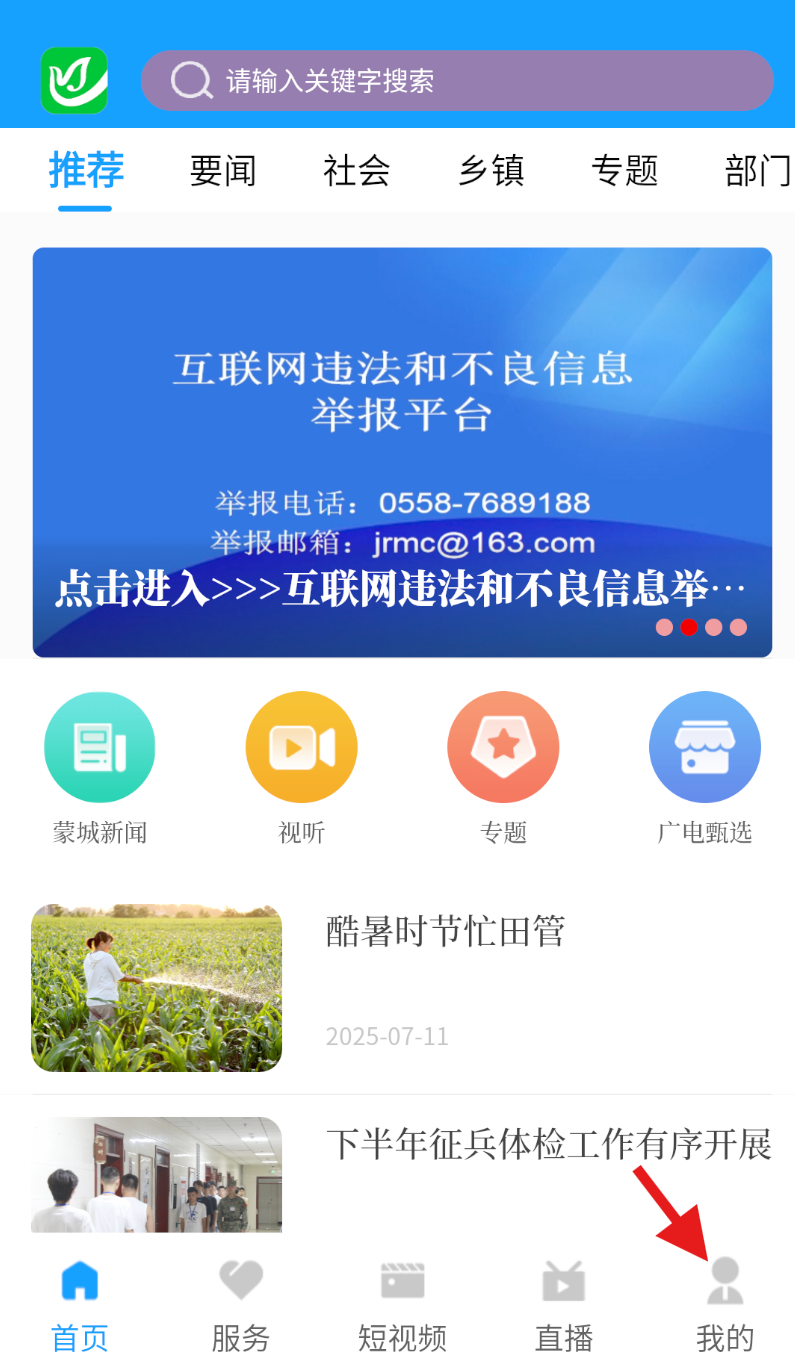 1、打开今日蒙城软件,在导航栏中找到 “我的” 选项并点击,进入个人相关的功能页面。